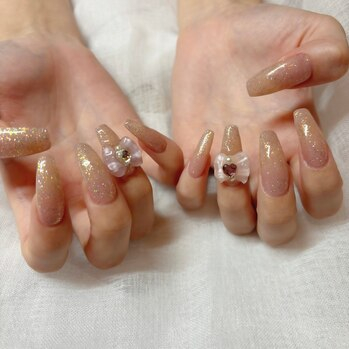今回はこのキラキラネイルデザイン紹介します☆フラッシュのラメ等ミックスしてます(*^^*)光に当たるとキラキラしてとても可愛いデザインです*+:リボンのおっきいパーツも目を引くデザインです!