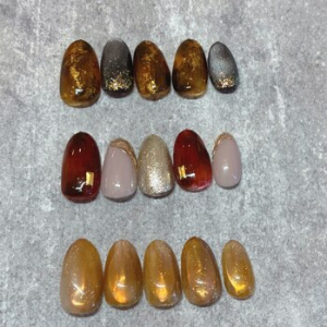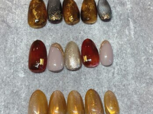 秋っぽくブラウン系やボルドーでサンプル作りました!秋ネイルの定番べっ甲ネイルもあります☆その他店内サンプルも色々ご用意しております!