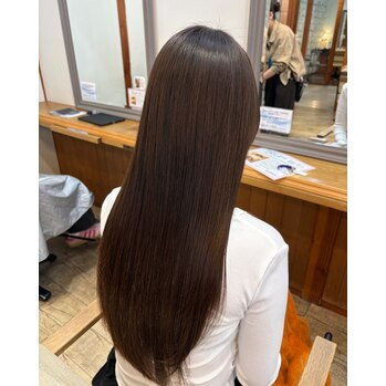 当店の縮毛矯正は、できるだけダメージをおさえた薬剤と温度設定で、するんと自然なストレートに♪写真のように毛先までツヤが出て、指通りなめらかに仕上がります!